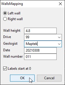 Allows the user to define whether the wall being mapped is on the left- or righthand side of the drive. When Left wall is selected the section will be created facing with the back point on the left-hand side of the screen and the forward point on the right-hand side of the screen. When Right wall is selected the section will be created facing with the forward point on the left-hand side of the screen and the back point on the right-hand side of the screen.
