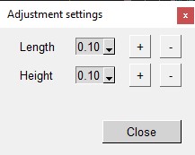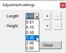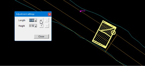 Allows the user to adjust the faces distance from the survey station and also the height, realtive to the original position. Once ‘Adjust dimensions’ has been selected the user will be presented with a floating panel that allows the adjustment of the faces distance from the reference survey station and also it’s height, relative to it’s current position. Each dimension can be adjusted by increments selected from the drop-down list and using the ‘+’ or ‘-‘ buttons to shift the face away from (‘+’) or towards (‘-‘) the survey station and up (‘+’) or down (‘-‘) relative to it’s current position.