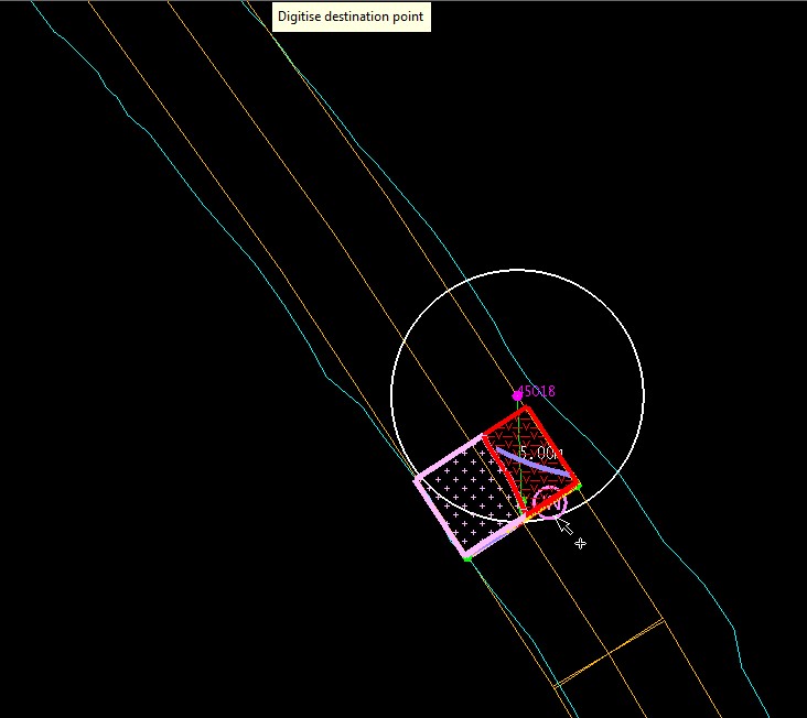 Allows the user to move the face in plan view relative to the recorded distance from the reference survey station. Once ‘Move face’ has been selected the user will be presented with an arc that represents the distance value that was recorded from the reference survey station and a labelled arrow displaying this distance from the station to the centre point of the face. The display settings for the arc and label can be assigned in the 'display' parameters in the Design To Actual settings.