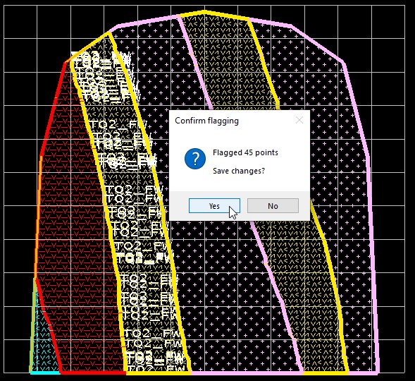 Once finished digitising right-click to close the polygon to flag the selected points with the point name concatenated from the selected domain and “HW” or “FW” (for hanging wall or foot wall, respectively). If happy with the points flagged on screen select ‘Yes’, otherwise selecting ‘No’ will not flag any points and quit the tool.