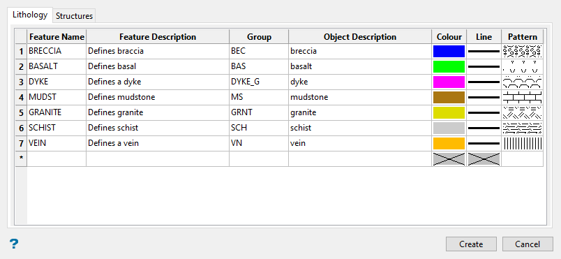 The Create Feature Files tool allows the definition of the desired features for lithology polygons and structural annotation lines.