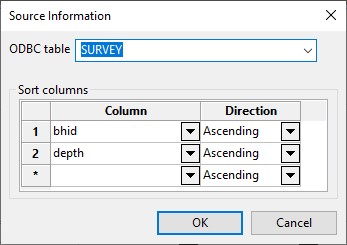 Next, each of the fields in the COLLAR, SURVEY, GEOLOGY and ASSAY tables need to be linked firstly to the correct table in the SQL database (using the ‘Configure’ panel for Source in the ‘Table Properties’ section) and the correct sort columns defined.