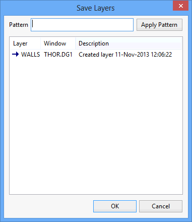 It is also possible to use the Pattern field, the Apply Pattern button and wildcards (* multi-character and ? single character) to highlight the layers that begin or end with certain characters (for example to highlight all layers that begin with 'P', type 'P*' in the Pattern field and select the Apply Pattern button). All matching layers will be selected (highlighted).