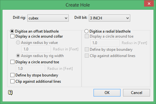 Use the Create Hole option to create individual offset or radial blastholes. Any new holes created by this option will be added to the working layout.