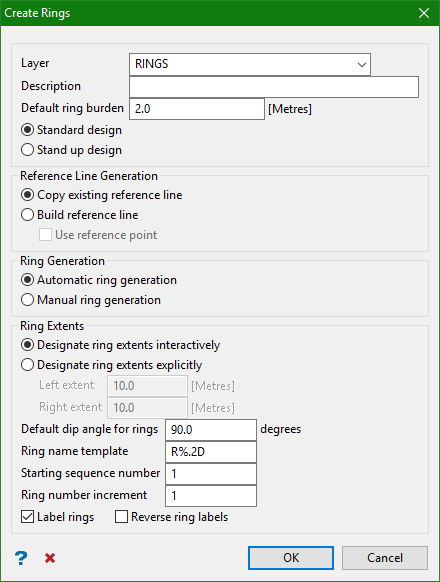 The Create Rings process is a preliminary step in the creation of blastholes. The Create Rings option to create a series of labelled rings in a ring layer, with their location based on the specified dip angle, ring burden and extents.