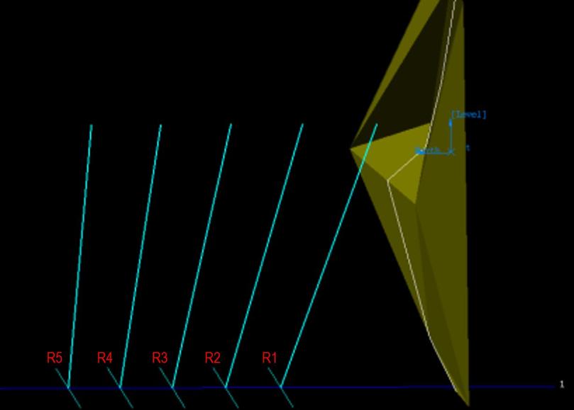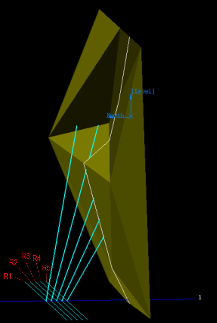 As shown in the diagram below, the rings are parallel to each other and set at the same dip angles. The void is represented by the triangulation. The initial ring plane is indicated by the first upward line on the left, which slopes upward based on the dip angle and the burden distance from the void at toe height.