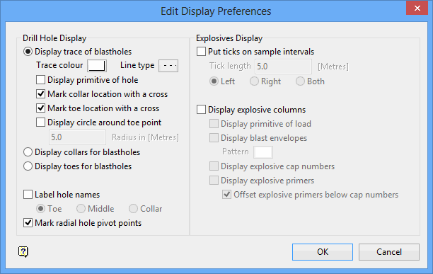 Use the Display Preferences option to view/modify the default display settings. When a blasthole is loaded for the first time, or updated after an editing operation, the hole is displayed according to the specified display settings. The display settings will be saved to the BlastDisplay.prefs specification file. This file will be stored in your users profile area.