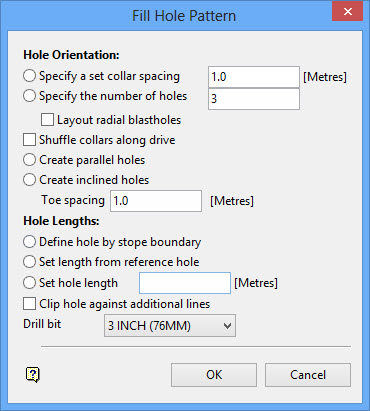 The Fill Hole Pattern option is similar to the Layout Hole Pattern option, however, the latter does not guarantee that the last created hole is parallel to a nominated structure, such as footwall or floor.