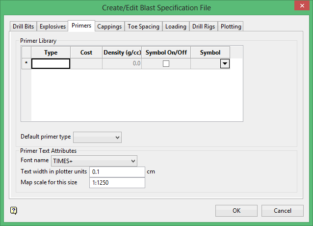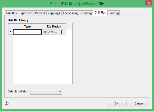 Use the Create/Edit Specification File option to create or edit the specification file that is to be used in the Ring Design and Explosive Loading modules. Unlike Version 5.0, which used the older <proj>.ug_spec specification file, this module uses the new Blast Design specification file (Blasting.spc).