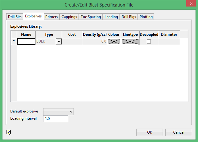 Use the Explosives tab to create and define the contents of the explosives library.