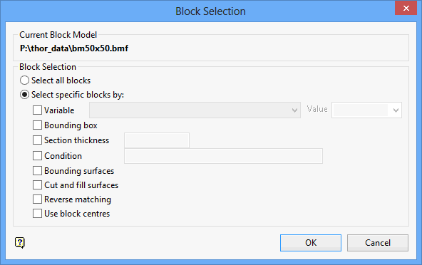 The directory path and filename of the currently open block model will be displayed at the top of the panel. The block model name will consist of the project code (<proj>), if specified, the block model file identifier (<bfi>), followed by the block model file extension (.bmf).
