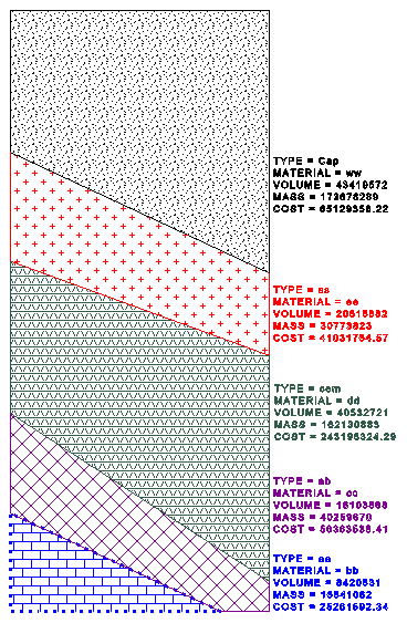 Enter the material properties such as fill type, material, density and unit cost. Vulcan will calculate a volumetric cost analysis bases on these numbers and provide an on-screen key showing the results.