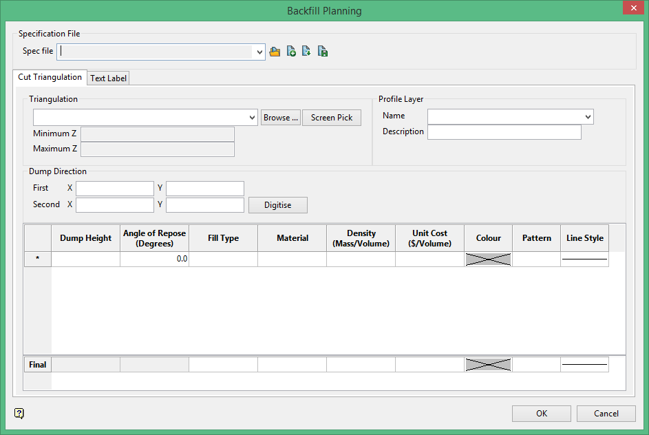 When you have enter all the materials in the table above, there will be one last layer. For this final layer, select the colour, texture pattern and line style just like you did for the other layers. There will be no need to enter a dump height or angle of repose since this is the cap layer.