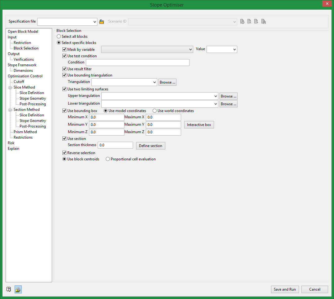 On the Underground menu, point to Analyse, click Stope Optimiser, and then select Block Selection from the tree menu on the left to display the Block Selection pane.