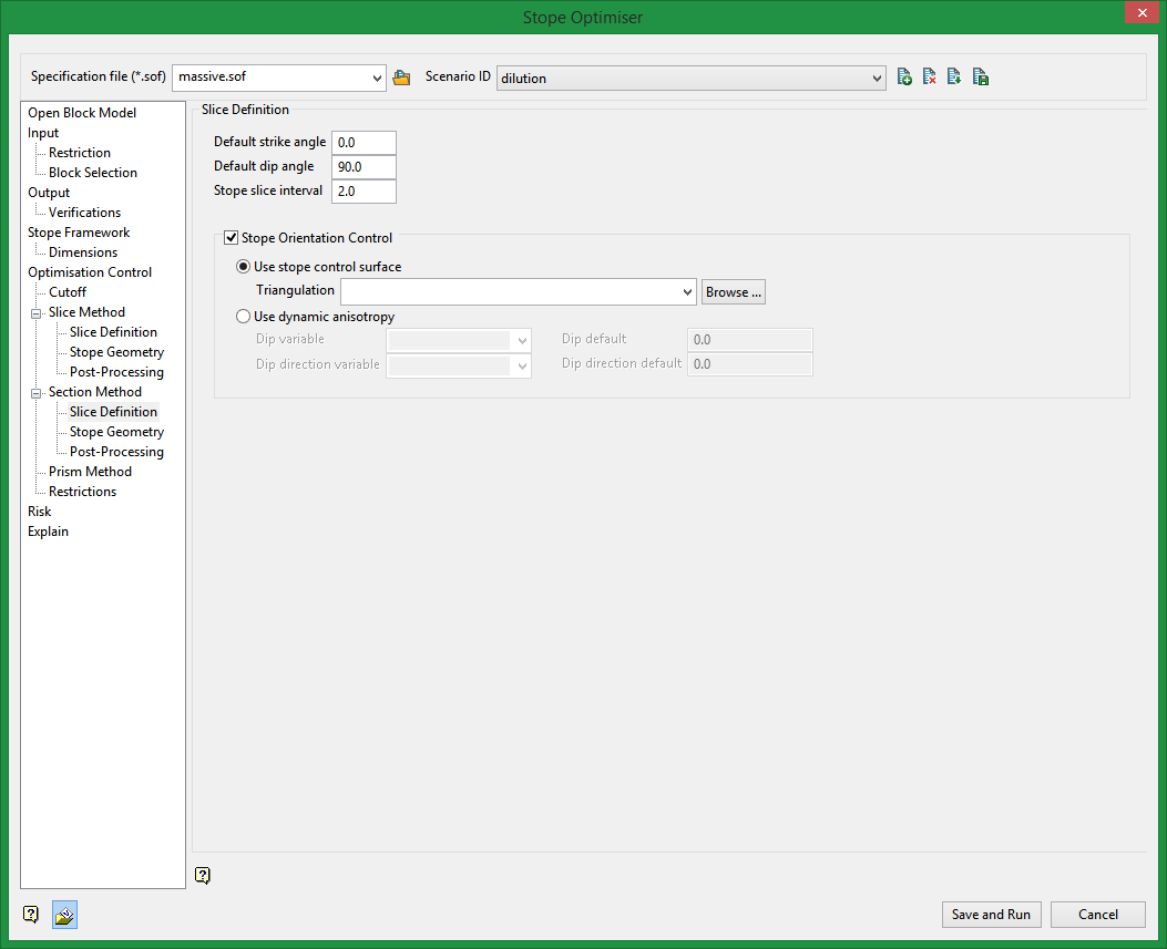 Use Slice Definition to define the dip, strike and interval default values for the stope slice. These will be used by the optimiser's algorithm to determine valid stope shapes.