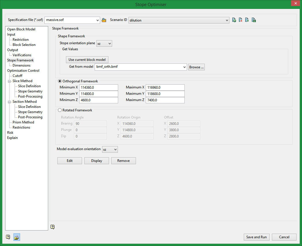 Select this option to populate the minimum and maximum extents from the currently loaded block model. It the block model is rotated it will select a rotated stope framework and populate orientation and extents appropriately.