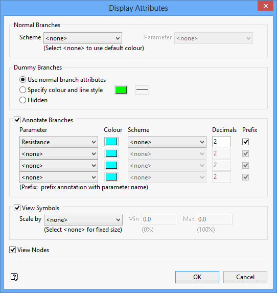 Use Display Attributes to set the display attributes, such as branch annotations, line styles and colours, for the branches of the currently loaded network file. This option also to toggle the viewing of symbols and node numbers.