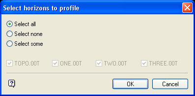 The lower half of the panel (beneath the radio buttons) lists all models in the horizons file. This may be grids (<proj><gfi>.<mv>g) or triangulations (<tfi>.00t). To select all models, choose Select All. To select some, choose Select Some, you will then be able to check the models that you want to include.