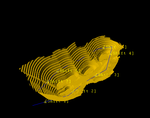 Select the points at which to look. Up to nine points can be selected, these points do not have to be on the line. In fact for best results you should select points close to but not on the line. Cancel when you have finished selecting points. Your points displays on the screen in the format Shift + n where n is an increasing integer between one and nine. You can select any number of points, including zero.