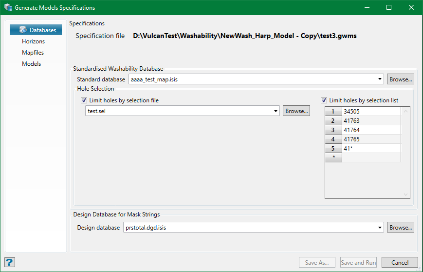 Standard database is the only required field in this option, which can be selected from the drop-down list or browsed to. By default, the wash data from all the holes in the specified database is used. However, if required, this can be limited by using a selection file and/or a selection list for which standard Vulcan wildcard may be used.