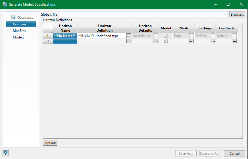 If the default glob file is available or a custom one has been selected, the horizon definitions may be auto-populated using all the seam names contained therein, by pressing the Populate button. They will be defined as Single Horizon Type horizons each using all of the intercepts for the nominated seam.