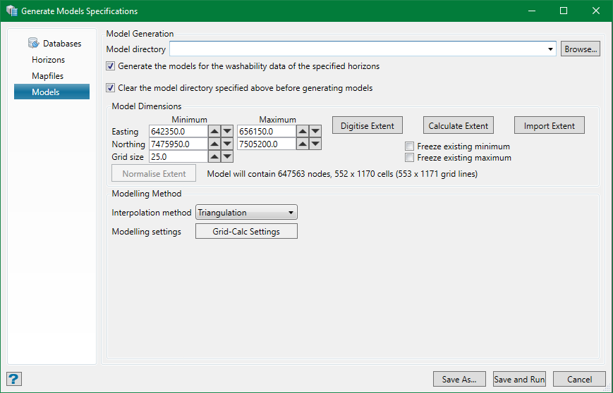 It is necessary to specify the extent of the area for the models to be generated and grid size to be used. This part of the panel behaves in a similar fashion to the Grid Calc functions in Vulcan. The extent can be typed in manually using the fields, digitised with the Digitise Extent button, calculated from the database data extent with the Calculate Extent button, or imported (along with the grid size) from an existing model with the Import Extent button. When a valid extent is available, it will be highlighted for the duration of the process.