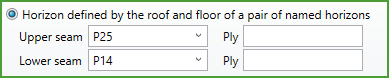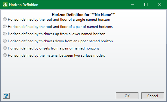 The horizons definitions data-grid contains the setup for each horizon to be modelled—one per line. The horizon can be a simple geological horizon (eg. a seam) or a composite of seams, depths, and so on to form a working section.