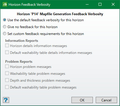 This sets the level of feedback to be generated to the log in the Washability Console during mapfile generation. This may be overridden for individual horizons, if required, by changing the Feedback option of the Horizon Defaults.