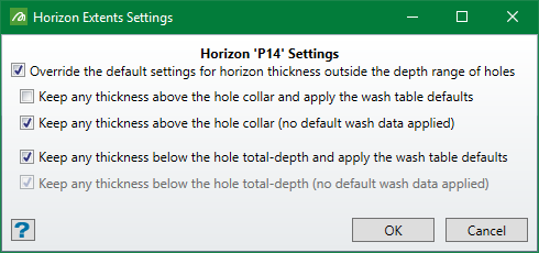 With the composite horizon definition types which use thickness, it is possible that the range of data selected can extend beyond either end of a drill hole. This can be an issue if default wash tables are to be applied to the gaps which include unlogged data at the ends. This option overrides the default settings for the thickness outside the range of holes. This can be set up in combination with other auxiliary settings provided.