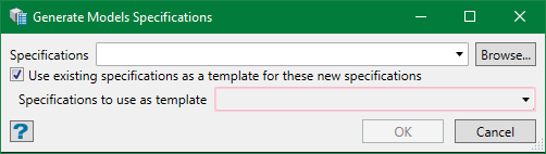 Click OK and the Generate Models Specifications panel is displayed. If a specification file is selected, the panel is automatically populated with the data from the file or else the panel is blank.
