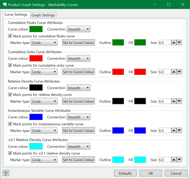 The system draws product graphs based on Maptek Chart system. Use this option to configure the settings of how those graphs are to be displayed on the screen. The product graphs can be seen from Product Graphs option in the Report from Washability Table menu.