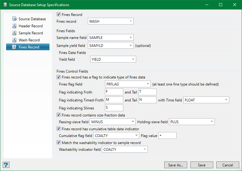 This record is optional if fines data have been captured from an analysis. The system deals with Froth and Tail, Timed-Froth and Tail, and Slimes data types. This record can be similar to Wash Record, but it is necessary to have field flags indicate what goes where in the same table/record group.