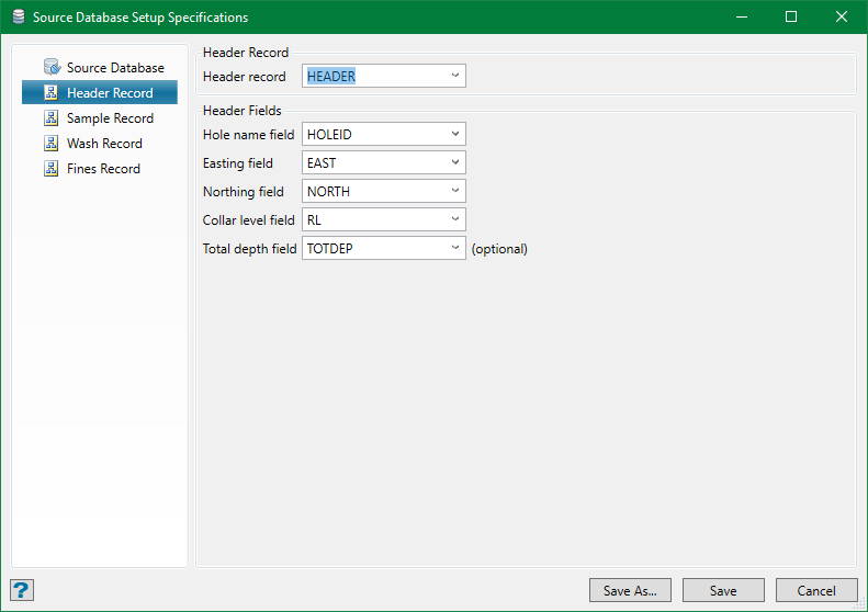 Select the required values from the drop-down list. The record must contain information defining the hole name and three coordinate values for the hole collar to qualify as a usual drillhole header record. Nominate the fields which contain these data. If available, it is also recommended to nominate the Total depth field as it can be useful when samples don't cover the full length of the hole.