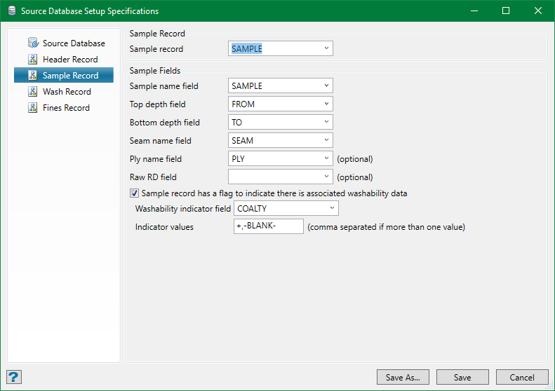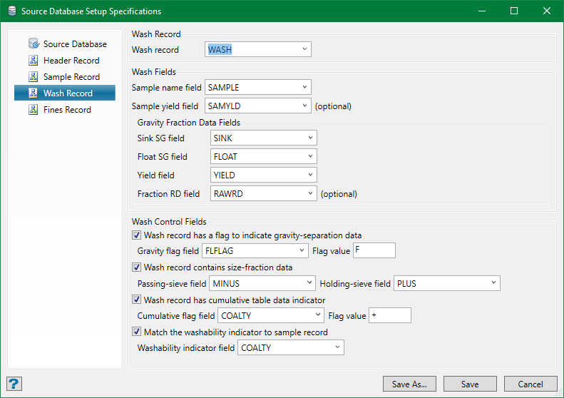 Select the required values from the drop-down list. These records are not part of usual drillhole data defining geology but a group of them is used to define a standard wash table. Each record is a single fraction in the table and therefore each record in the group must contain at least the sink and float densities used for that fraction and the yield of the sample obtained (Yield field) as well as the sample ID field used to match the analysis to the sample/depth log data.