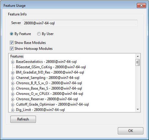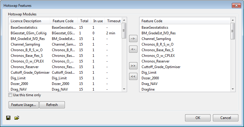 The Hotswap Features panel displays all feature upgrade modules for which your company has a licence. To add additional feature upgrade modules, contact your local Maptek office.