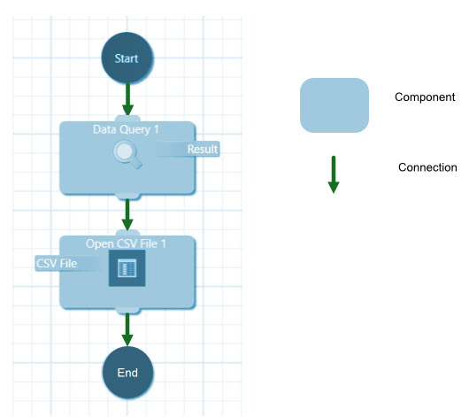 The workflow above contains two operations, which are called components. Each component represents an action to perform on the incoming data. In the given example, the first operation prompts the user to select a CSV file, while the second operation opens the CSV file. The two components are linked by an arrow indicating the flow of data through the diagram. This link is called a connection.