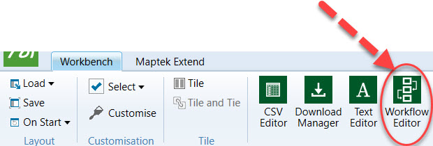 The Workflow Editor comes installed with the Workbench and can be accessed with a license to Maptek Extend. It can be opened from the start page, from the Workbench ribbon menu or from the Maptek Extend ribbon menu as shown below.